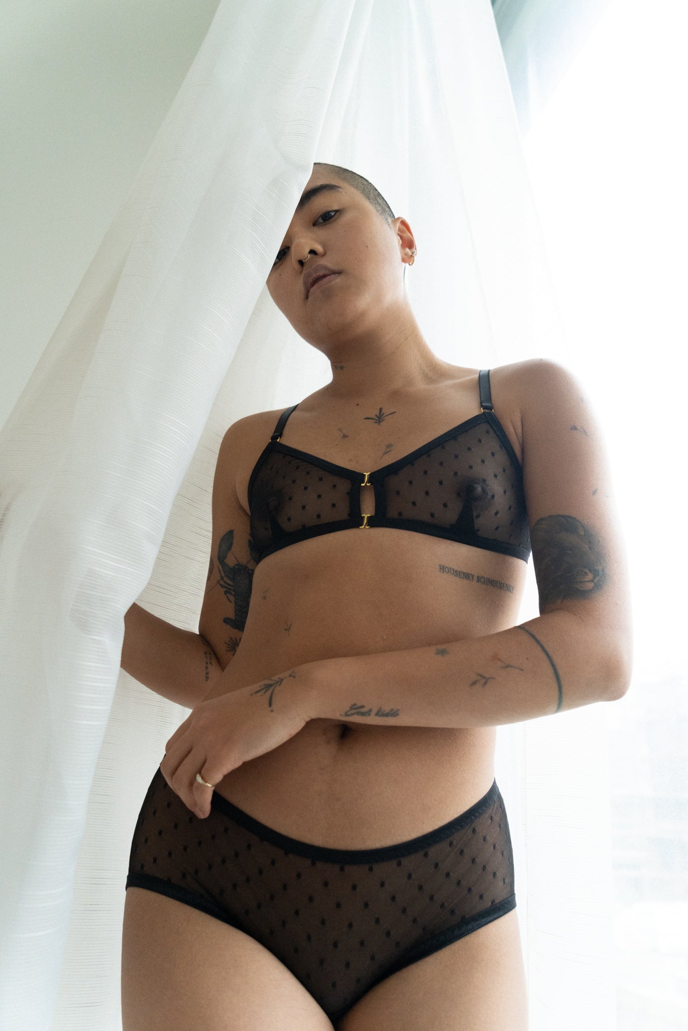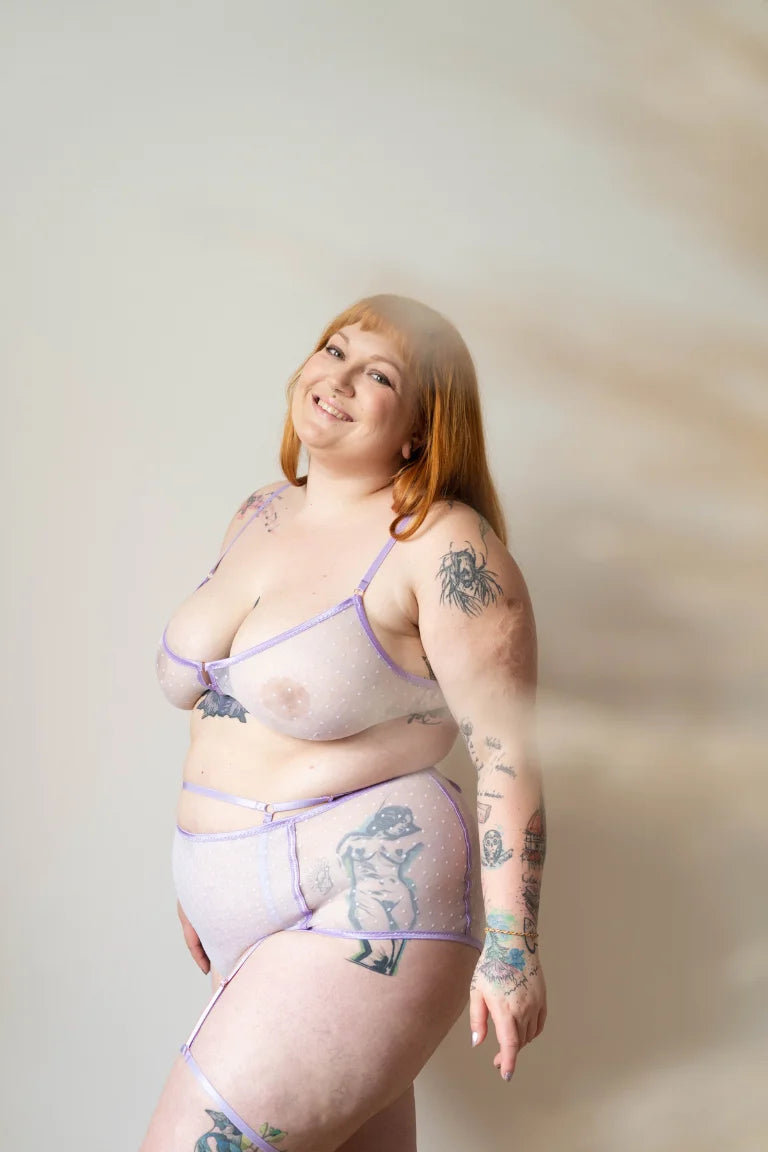 The Purly style features a lower rise compared to the Tichée, offering a flattering silhouette that highlights your natural curves. The back is elegantly framed with intricate lace, creating a beautifully defined look. Adjustable elastic bands beneath the buttocks allow for a customizable fit, ensuring both comfort and style.