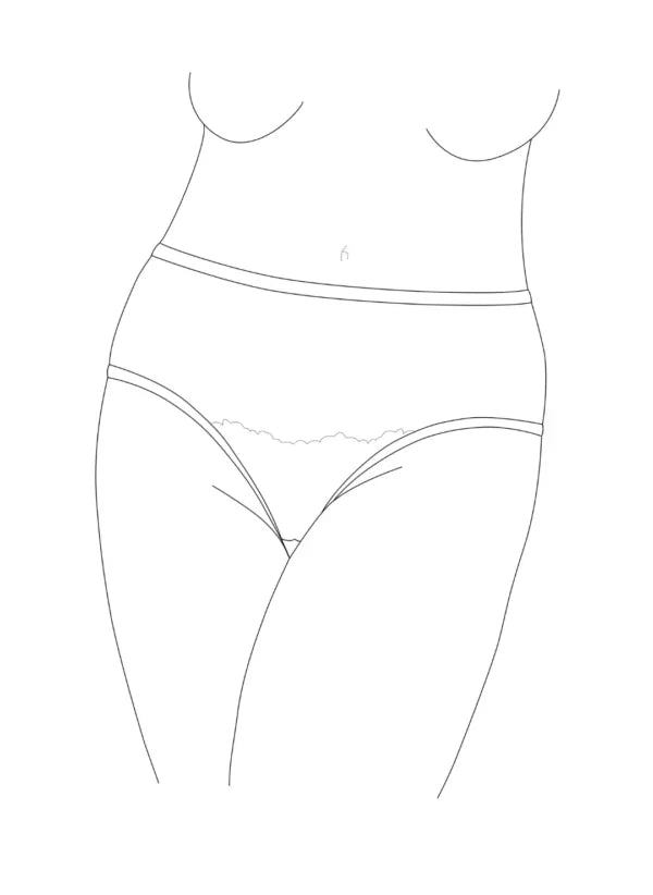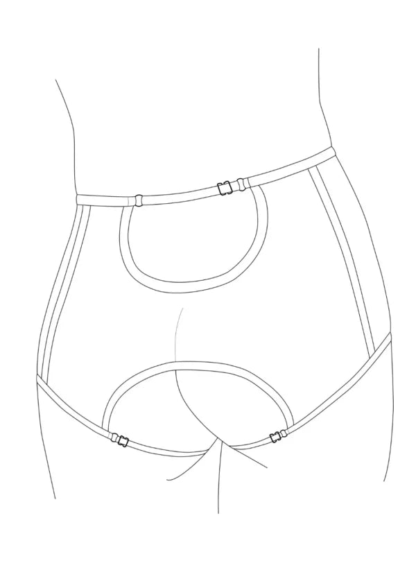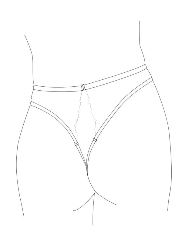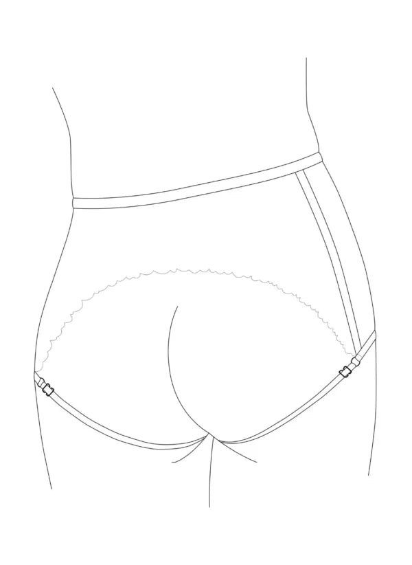 These are high-waisted crotchless panties that allow for adjustment at both the waist and beneath the buttocks. The back offers moderate coverage but teasingly reveals through sheer stretch tulle for a playful, subtle allure.